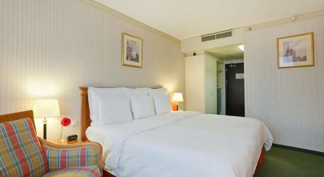 В просторном номере установлена 1 кровать размера «king-size» с пуховым наматрасником, одеялом и подушками.
